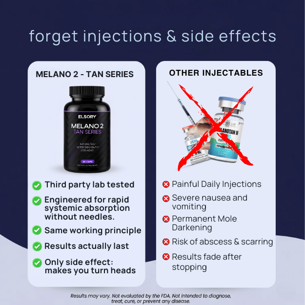 Using Melano 2- Tan Series for just 30 days supports melanin pathways by delivering key nutrients your skin needs to glow. Our formula helps you safely achieve a golden-brown, smooth skin tone often in less than 30 days as opposed to other products requiring injections, that cause serious side effects and are extremely uncomfortable.